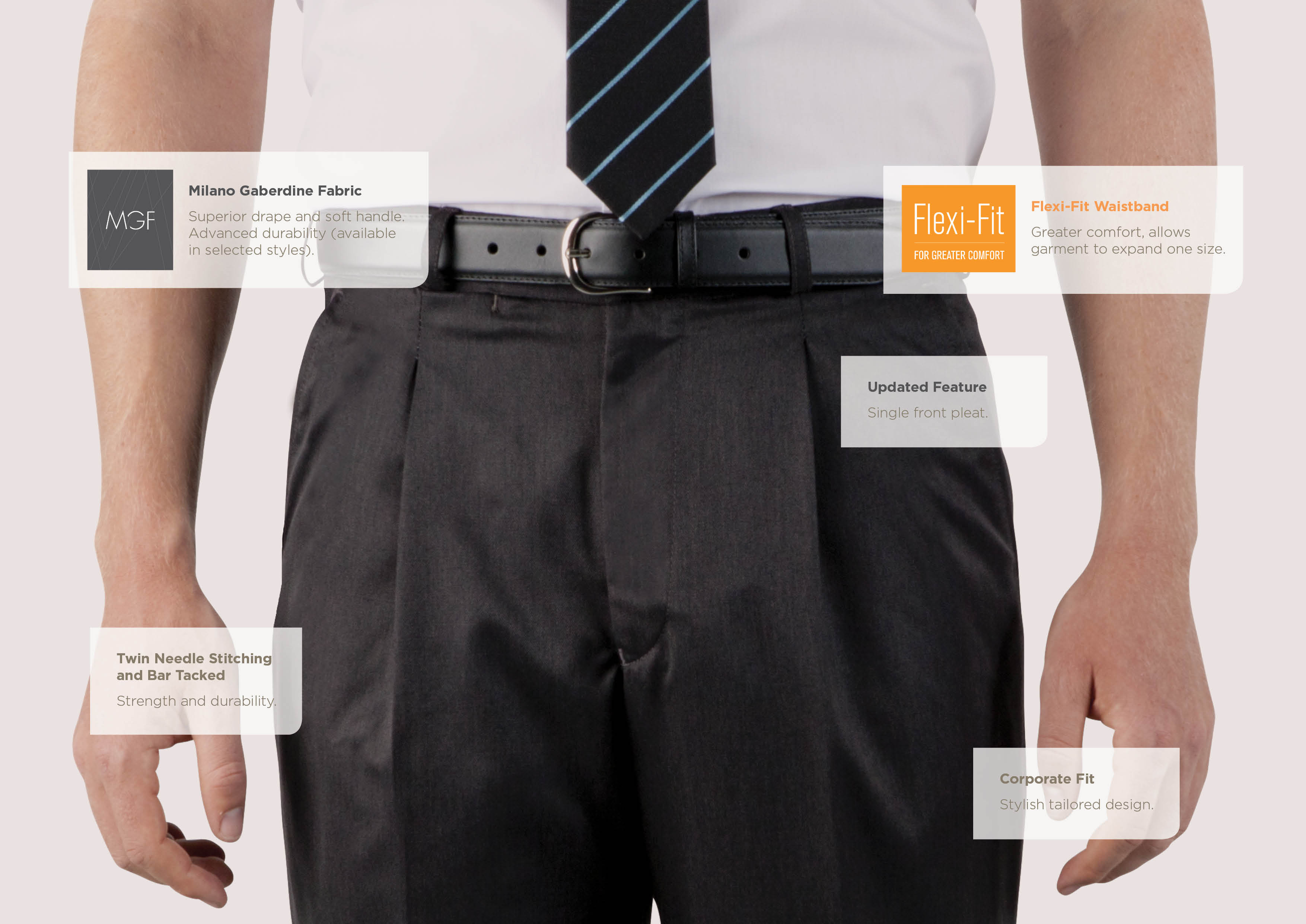 Milano Gaberdine top make trouser with Flexi-Fit adjustable waist, single front pleat with belt loops, right hand side fob pocket, back jet pocket.